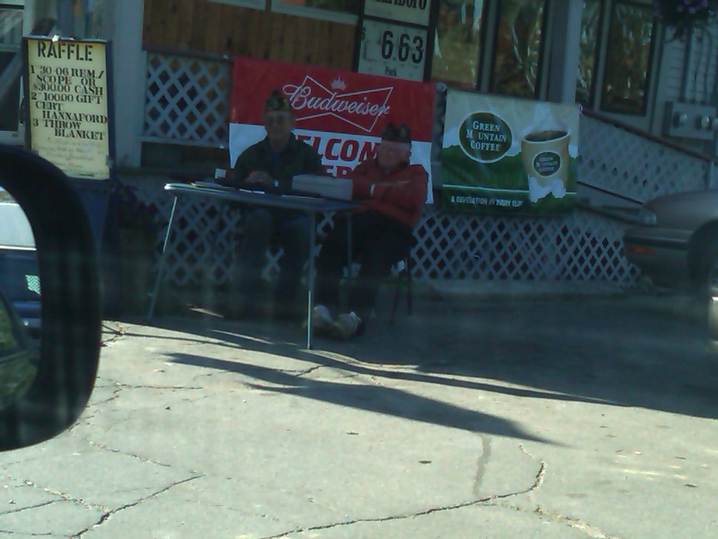 I had to buy raffle tickets from these two men. It was a hunter's breakfast raffle with money going to American Legion Post 192. I will know if I win on November 5th - a week after the start of hunting season, but whatever... I bought the tickets because I need a new scope for my gun. I didnt read their sign very well because I can also win the 30-06 to go with the new scope. New gun? yes please.