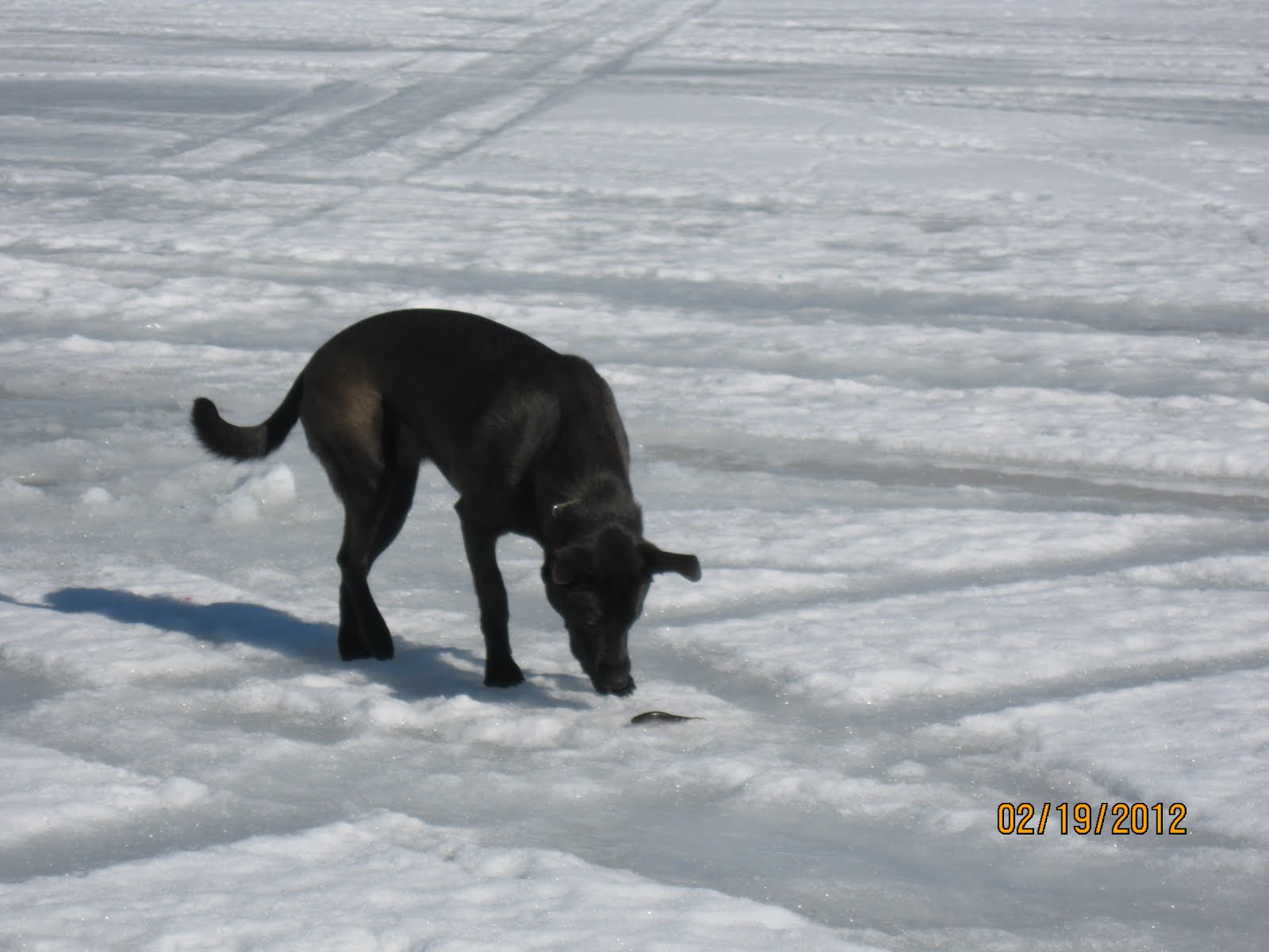 Before I arrived on the pond, Duckman had caught a 6.5 pound pike. I thought it was a huge fish and my dog had no idea what it was and kept coming over to smell it. All I could envision was her grabbing the thing and running. And then dropping it down a hole. Then I would owe Duckman more than I do (Leah thought she could help herself to some chowder). As Leah ran around, she found a dead bait fish and became intrigued. She would put the thing in her mouth, tail hanging out, run a little and then drop it. She had no idea what to do with the fish, what it was or what she should be doing with it. The last thing I wanted was for her to swallow the thing. So instead, I ruined her fun - picked the fish up and put it back into a semi-frozen hole that Duckman had abandoned earlier. All she could do was try to figure out how to get it back. There was a thin layer of ice, so in some parts of the hole, she hit ice instead of fish. In the spot that I dropped the fish into, she couldn't quite get her mouth into the water enough to get it without driving it further into the water. After a couple of minutes, she gave up. But, being the dog that she is, she found Uncle Kim who had vienna sausages and Matt and Ryan who had peanuts they would give her.