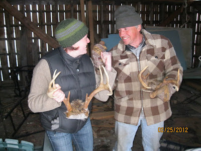 We each held up our antlers, mine from last year (we remeasured and they have a 13.25 inch spread) and Dad's from the 6-pointer the year before. He joked (I think) that the gloves are coming off next season and its every (wo)man for themselves. Hubby suggested we take a fighting photo. Don't we look mean??