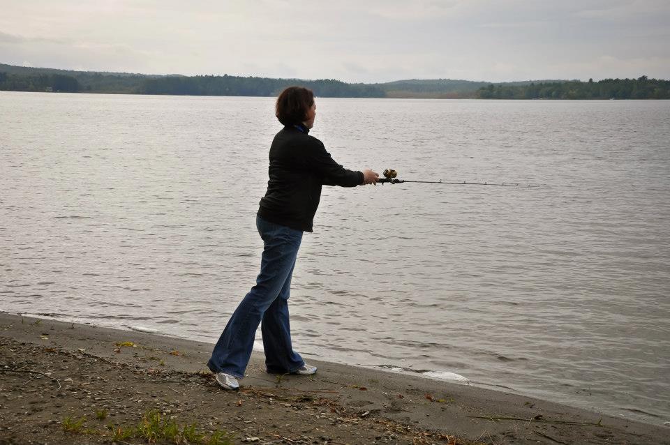 We were using closed-faced rods, so unlike my rod at home, there was a button that I needed to push to let the line out. We spent time casting without bait on the hook first. It was a sad state of affairs. I tried and I tried and the bobber would end up maybe 2 feet away from me. At its worst, it ended up at my feet. Don assured me that it was equipment failure and attempted to prove it. His cast went about 20 (probably more) feet into the water. I tried again and again. Having helped the other women with their casting and preparing to bait our hooks, Don assured me that there must be a knot in my line and processed to pull line out of the reel until he found what might be considered a knot.