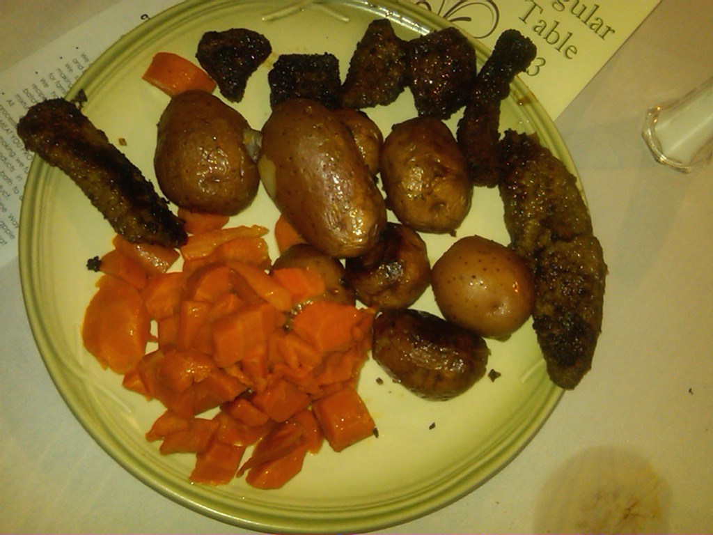 Dish 5: Venison Cutlets in a white wine reduction, roasted red potatoes and carrots -