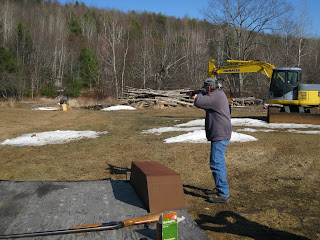 Hubby and I were up at Mom and Dad's for Easter weekend and decided to break out the guns on Saturday afternoon. We were using #6 and #8 shells (I apologize right now for any and all incorrect terminology that I am about to use! I will get it after a while) but will be hunting with #4. Dad has a pump 12 gauge and a break action 12 gauge. The neighbor stopped by to talk to Dad, found out I wanted to turkey hunt and brought over his 12 gauge for me to use.