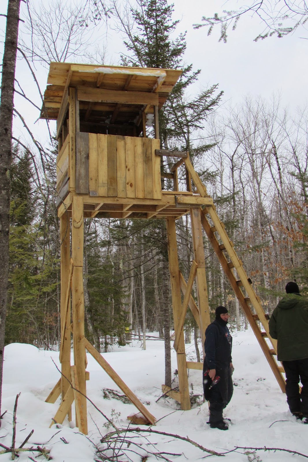 He built it in the barn and we tested out sizes, wall height and visibility. We were going to put it up in late January but time got away from us and February hit bringing about five feet of snow in four weeks. So instead, Dad used the snowmobile to bring pieces of the stand over to our build spot.