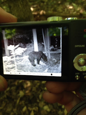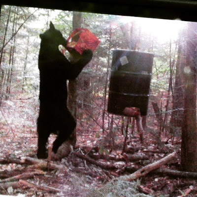 Steve and Lorri had set up the two bait sites a few days before and we were eager to see if any bears had found the sites. The monsters from last year were not killed so we knew that there would be some big bears around. We hiked into Site 2 first and carried buckets and tools in. Steve led the way and we anxiously kept peaking around the corner to see if things has been moved. They had!! We dropped the supplies and did what almost every hunter does - check the trail cameras!