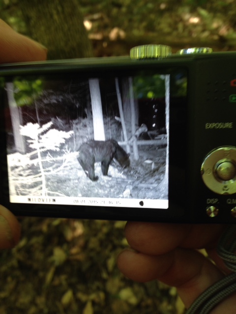 When we looked closer, we could see that one of the milk crates was almost totally empty! We eagerly looked at the trail camera to see if it was racoons or a bear. What a surprise! This beautiful bear is standing on it's hind legs and is easily eating out of the crate that is hanging about 6 feet off the ground. Also, it is during daylight which is what every hunter wants to see. Typically, bears stay nocturnal so when you get photos during the day, that is (hopefully) a good sign.