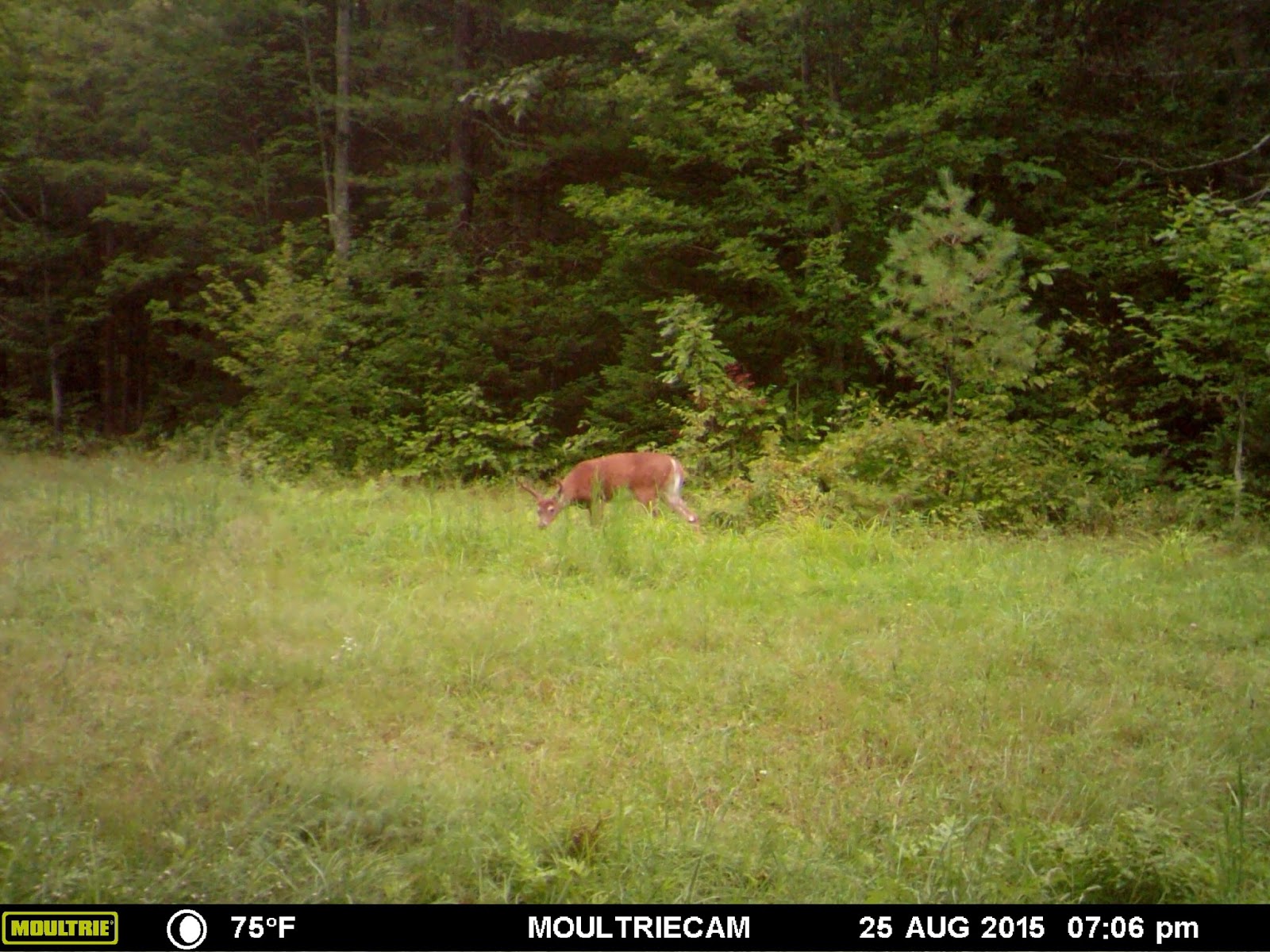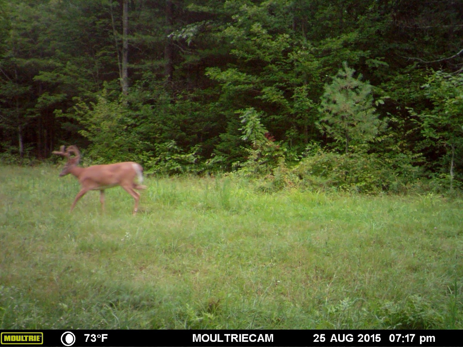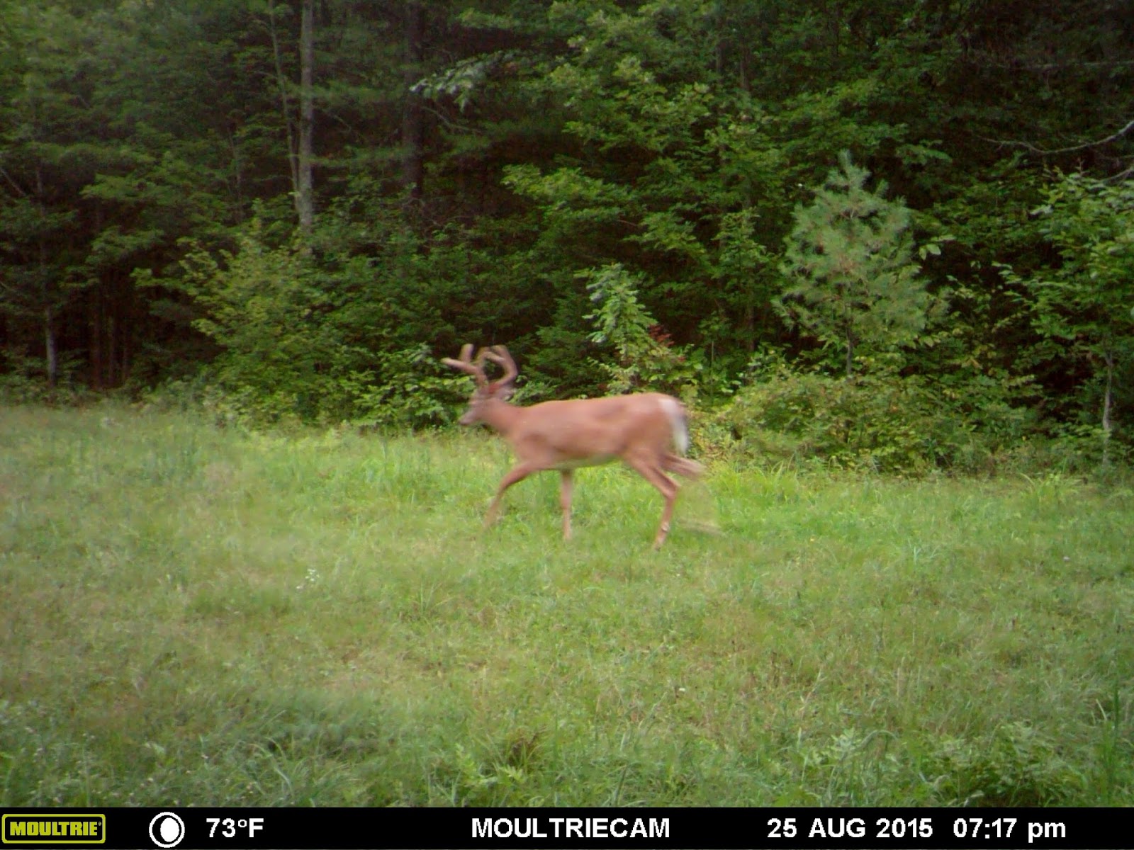 Look how wide those spikes are! No brow tines on this guy. When you zoom in on the second picture, this looks like a crotch horn. He has a decent body too, which would provide us with some excellent meat this winter.