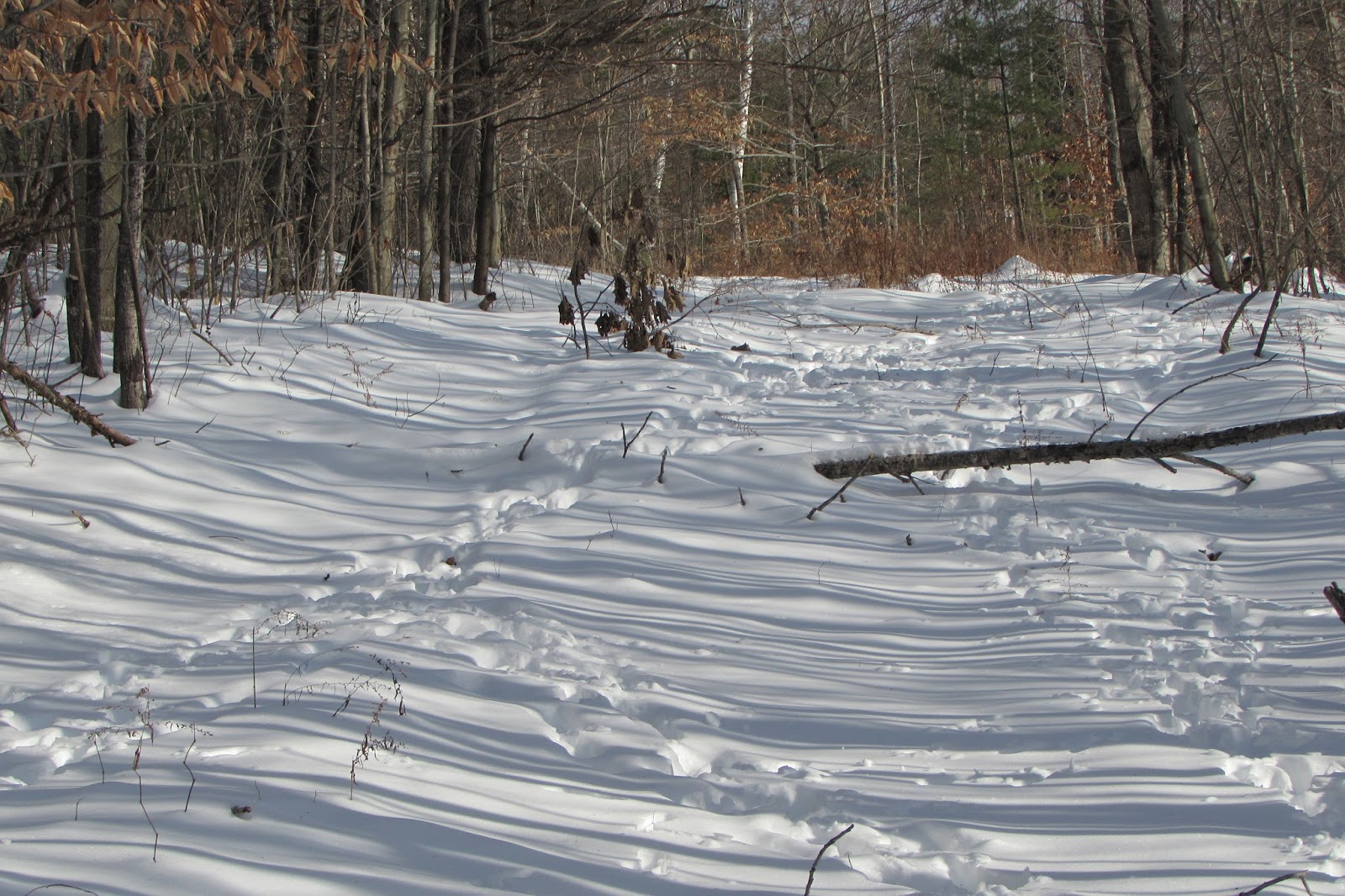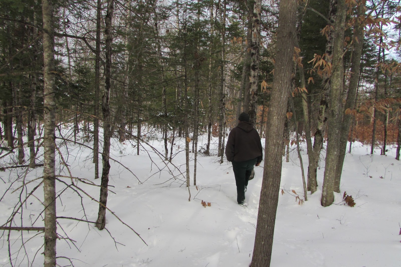 We followed this trail to find out how close the deer were staying compared to where our tree seat and the Sky Condo are. We could walk a few yards and find another well worn path or a deer bed or two or five. During our entire woodland adventure, I counted 17 deer beds of all shapes, sizes and ages. About seven inches of snow fell the week before so we could tell that the beds with the bare ground underneath were made the night it was snowing. This also helped us age some of the tracks.