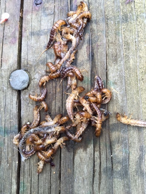 I somehow got through it and had Steve help to pull the insides out.  In the fish's stomach, was a pile of these bugs (which Google said are May Flies) which started to come alive once they were free from the inside of the fish.  That just grossed me out even more.