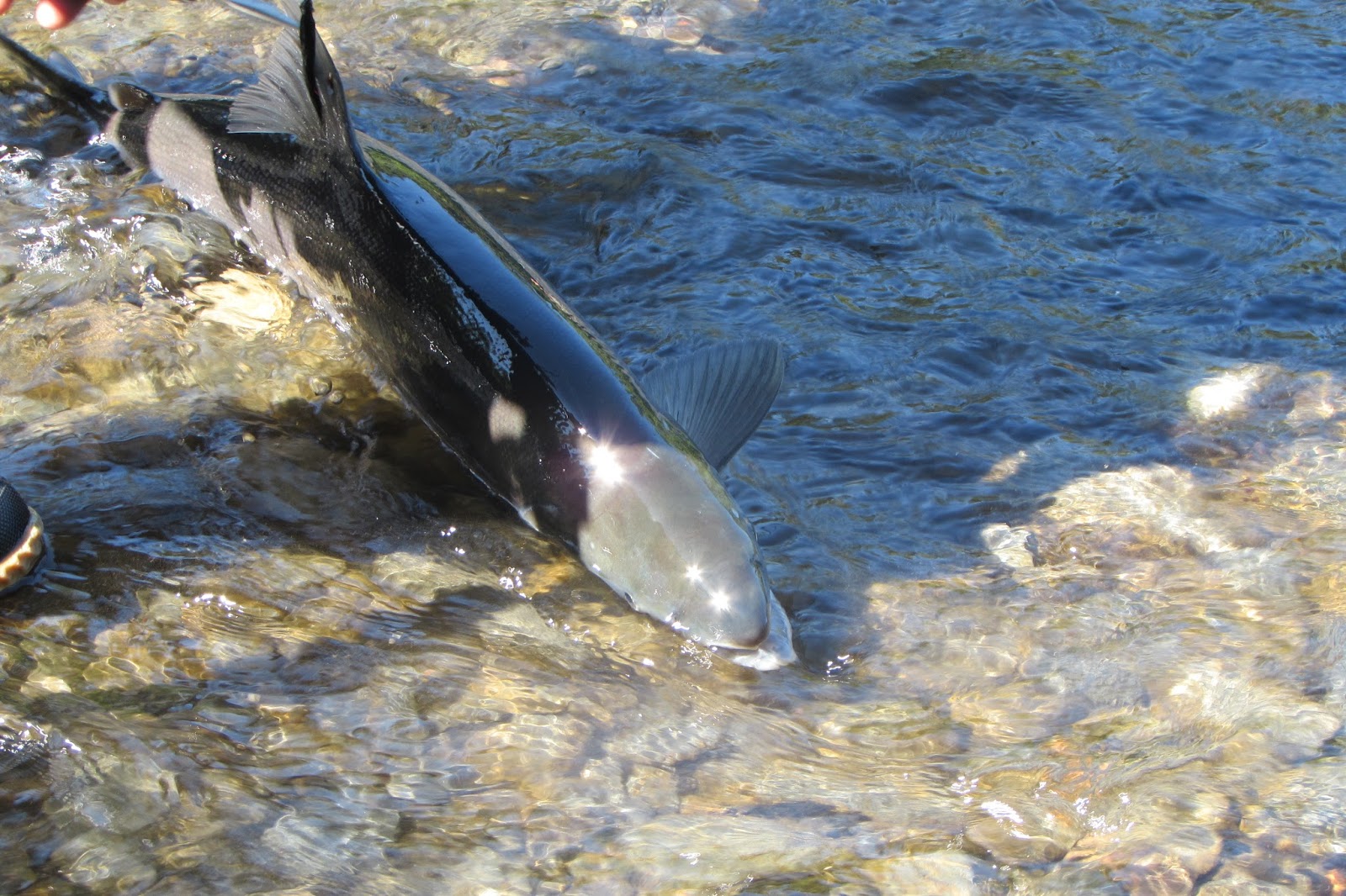 I found a guy later in the day who knew what he was doing and had fish on every other cast, it seemed. He was using a fly that was specifically for the river and it seemed to be working. I watched as he caught a salmon but because it was not hooked in the mouth (he caught its back), he had to release it back into the water and try again.