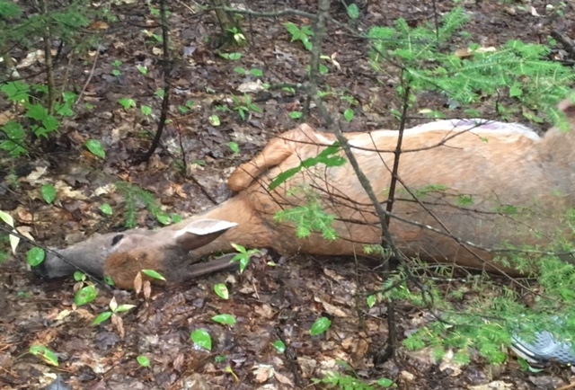 The driver pulled over and began to walk along the edge of the road to see if the deer was OK. I pulled over on the opposite shoulder and asked if he was OK. We saw the doe struggling to get up and she made a horrific noise. I assumed that she had a broken leg so I asked my mom to leave me on the side of the road with the driver and go to my house to get the gun. I placed a call to dispatch was put in touch with a warden. He asked if I was able to dispatch the deer and if I wanted to. The last thing I wanted was for this deer to suffer so I said yes and wrote down the tag number.