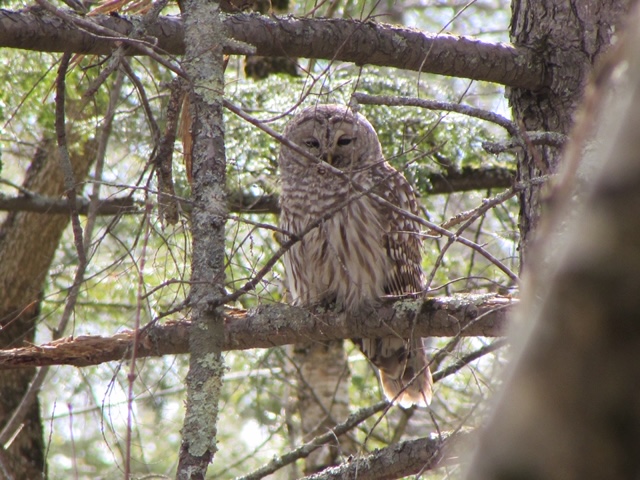 We have known since we bought the house, that there were owls around. I frantically flagged down Hubs when I was on the phone being intereviewed and saw one land on a dead tree across the backyard, so that we could get some pictures. We hear them at night calling to one another and occasioanlly, we hear them in the morning when we take the dog out. There is two, maybe three nearby.