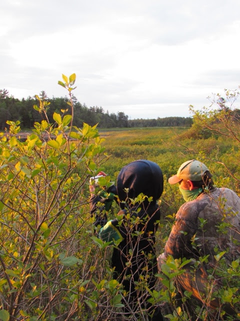 The weather called for rain but we were determined to find a few moose before the storms rolled in. With bug spray, binoculars, cameras and face masks, we headed out on the Golden Road to find some moose. We didn’t have to go far before Paul spotted a young bull. Excitedly and quietly, we hiked close to the edge of the pond to get a better view. The sun was just starting to crest the trees and illuminate the snow on the peak of Katahdin. It was one of those moments that makes you take a deep breath and just be grateful - even amid the swarm of mosquitos.