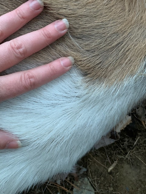 Dad met up with me and walked with me to where I had last seen the deer. I was telling him about everything that had happened. The doe was laying in the trail. Even on the ground, she was a big doe. I stopped mid sentence as I got closer and my heart sank. I had not shot a doe. It was a spikehorn. Urgh!