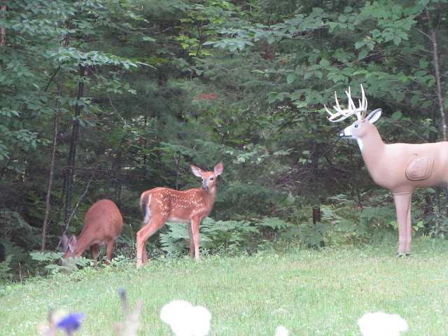I am not sure if the target in the backyard has made the deer around here more relaxed or not, but for this fawn, it wasn't sure what to make of this thing that looks like a deer but doesn't move. If this target can fool these deer, I am wondering if we could use it as a decoy during hunting season... that is something that I will need to research!
